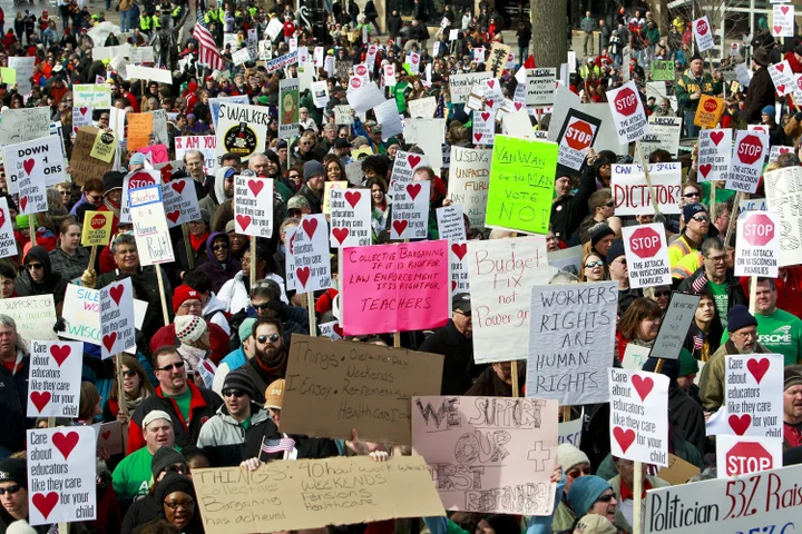WASHINGTON -- Though thousands of Americans have turned out this week to show solidarity with Wisconsin's public employees and oppose a threat to their collective bargaining rights, union officials say they have not been able to place a labor voice on this Sunday's editions of the weekly public-affairs TV shows. The shows' producers, they complain, are shutting out the workers' perspective.