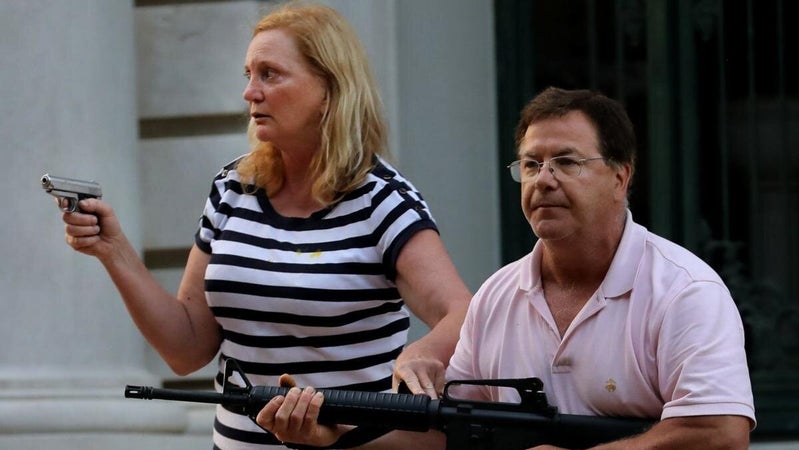 Mark McCloskey and his wife, Patricia McCloskey, were charged with felony unlawful use of a weapon.