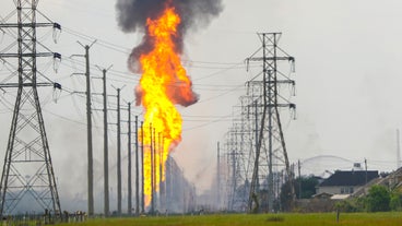 A giant plume of fire shot into the air for more than two hours on Monday as first responders worked to evacuate surrounding homes.
