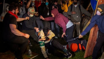 Dueling groups of protesters clashed at the University of California, Los Angeles, grappling in fistfights and shoving, kicking and using sticks to beat one another.